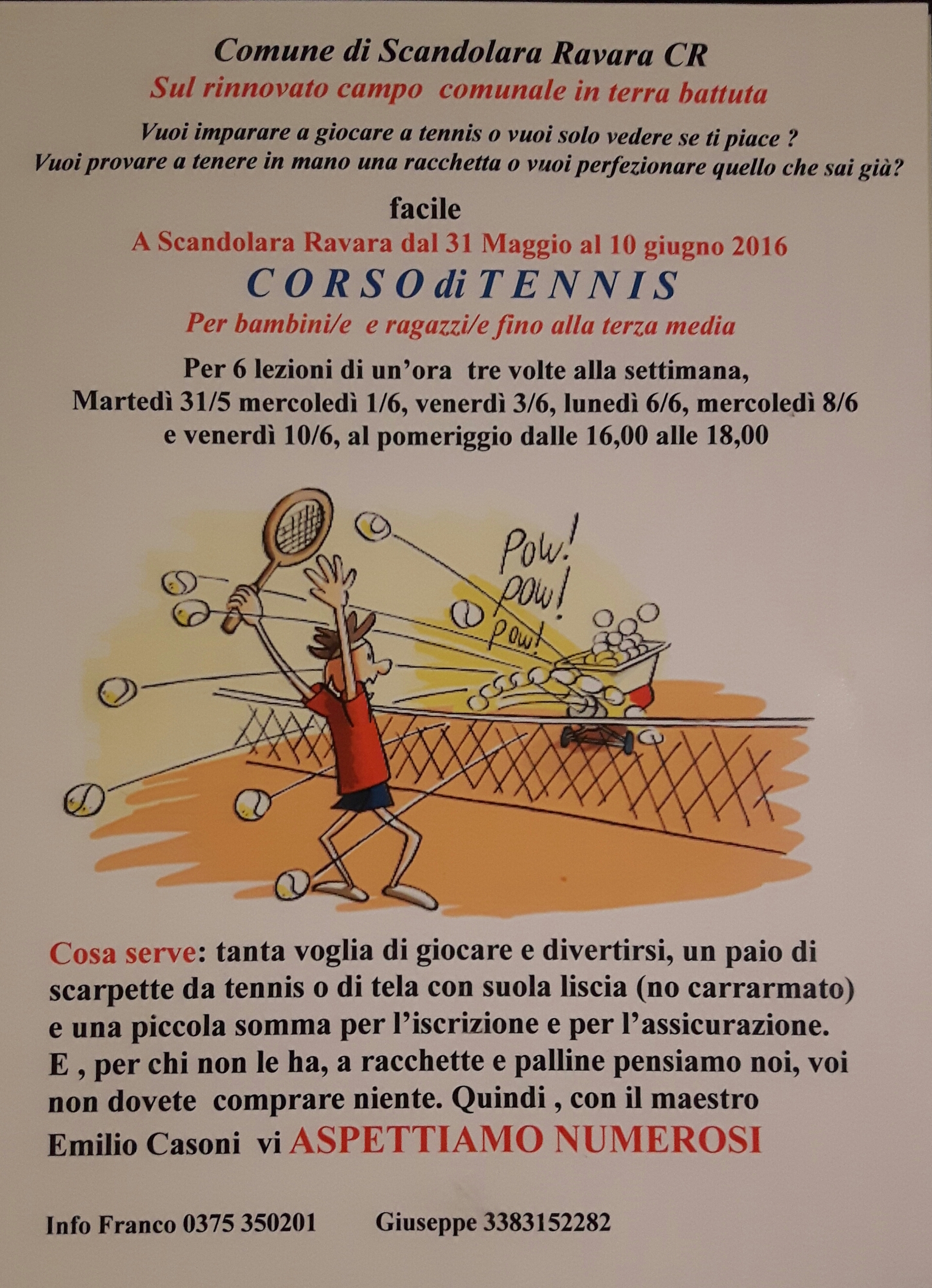 Il Comune di Scandolara Ravara organizza dal 31 maggio al 10 giugno 2016 un Corso di Tennis per bambini/e e ragazzi/e fino alla terza media. Si allega Volantino informativo.
